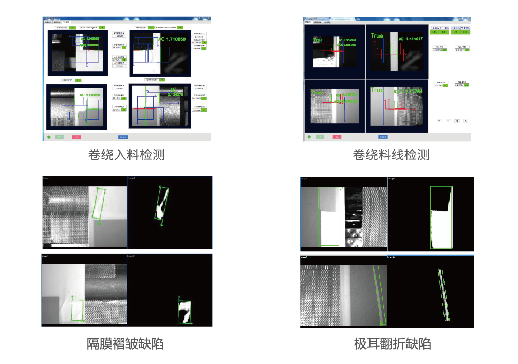 卷繞機是鋰電池成型的主要設(shè)備,通過驅(qū)動卷針將正負極片和隔膜按照特定的次序卷繞從而形成電芯,在此過程中,需使用視覺進行對齊度糾偏,同時識別相機視野范圍內(nèi)的涂布、隔膜缺陷,以保證產(chǎn)品質(zhì)量。我司采用KINOVISION視覺檢測平臺對卷繞過程中的陰陽極距離和整體電芯的尺寸進行檢測,同時創(chuàng)新采用深度學(xué)習(xí)相關(guān)算法,實時檢測涂布和隔膜的各類缺陷,提升產(chǎn)品質(zhì)量,該方案已批量應(yīng)用于鋰電客戶。