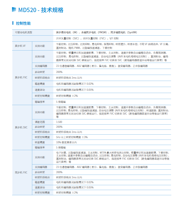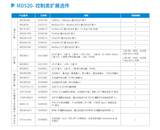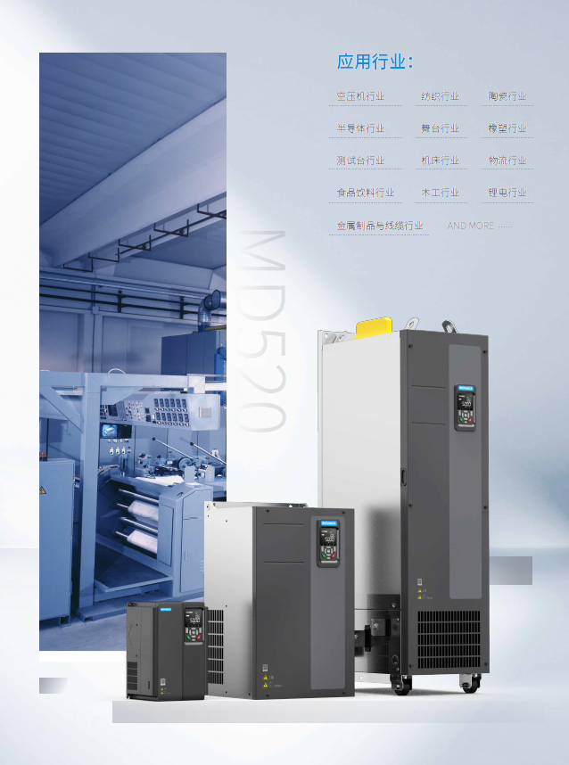 MD520系列變頻器是一款通用高性能電流矢量變頻器,主要用于控制和調(diào)節(jié)三相交流異步電機和三相交流永磁電機的速度和轉(zhuǎn)矩,可用于紡織、造紙、拉絲、機床、包裝、食品、風機、水泵及其他自動化生產(chǎn)設(shè)備的驅(qū)動。